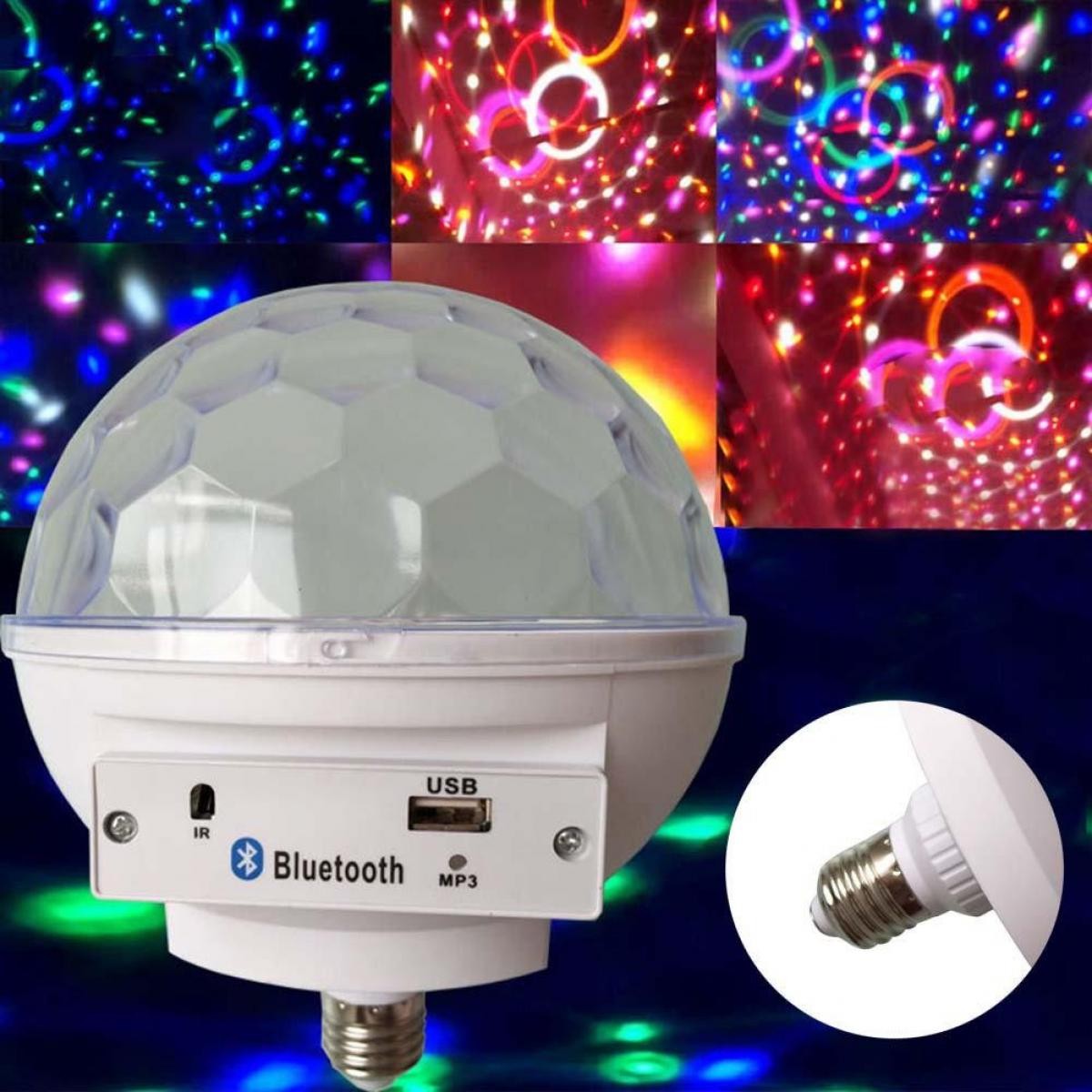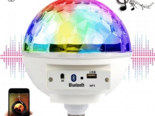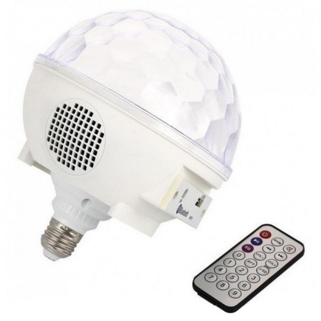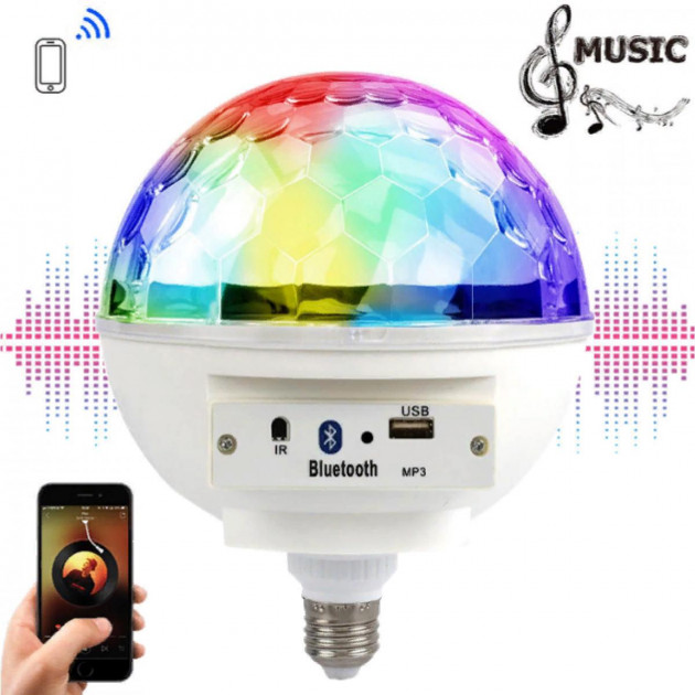Диско шар LED Crystal magic ball light E27 997 BT имеет компактный дизайн в виде лампы, вкручивающейся в стандартный патрон, встроенный модуль беспроводного подключения Bluetooth и USB вход для подключения флеш-карт с музыкой в MP3 формате.