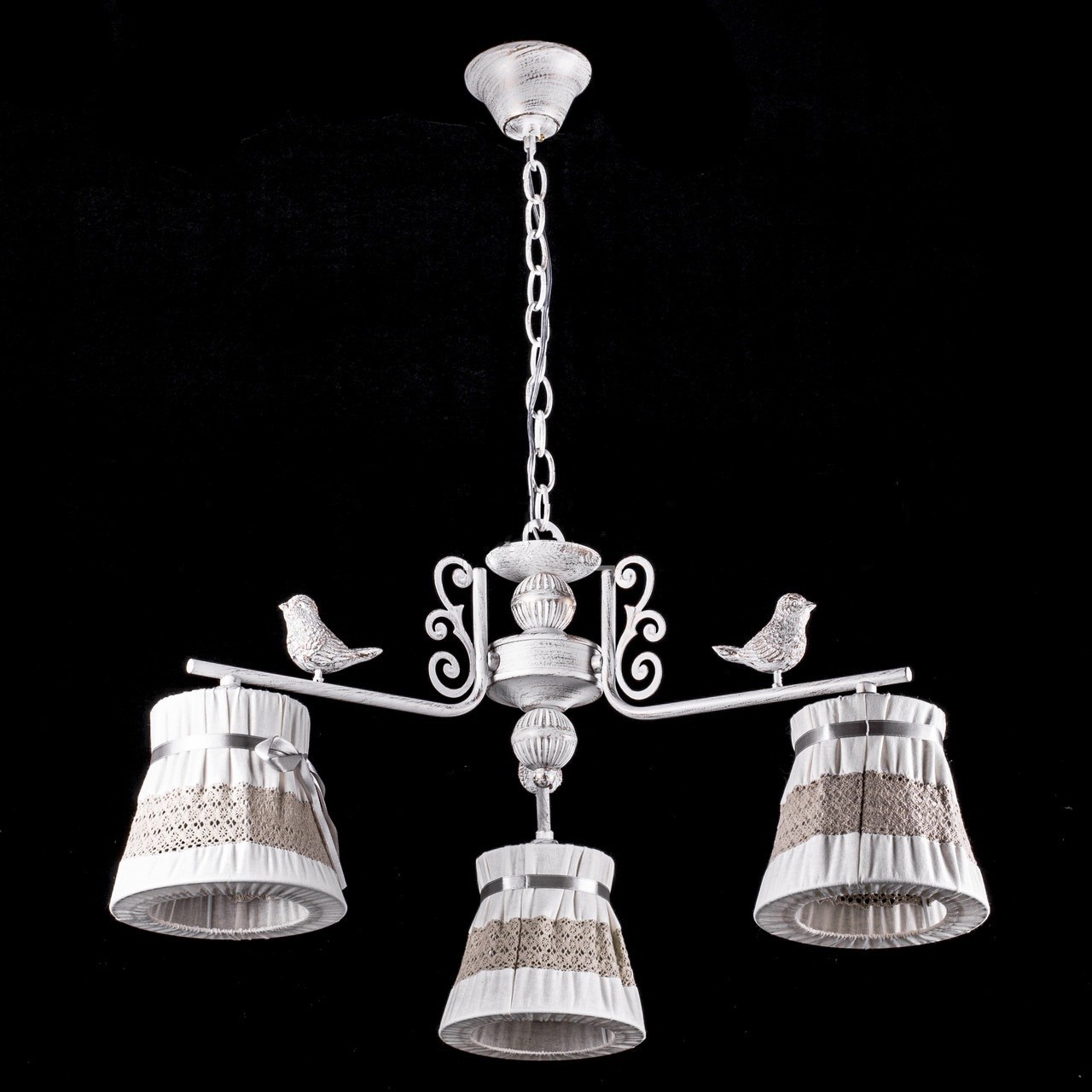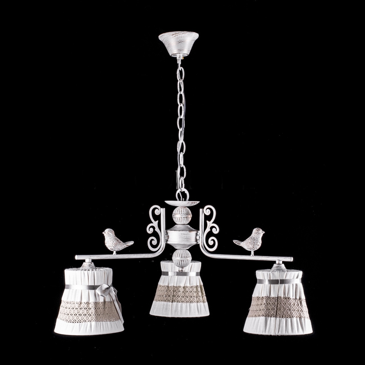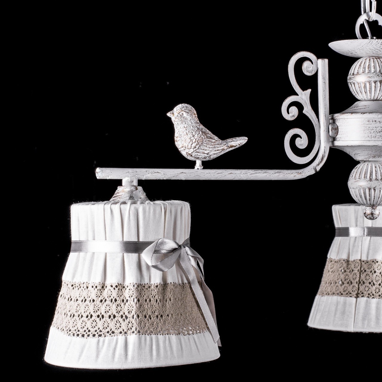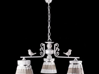 Люстра на цепи в стиле прованс идеально подойдет для светлого интерьера гостиной или спальни. Каркас люстры изготовлен из прочного, но легкого сплава металлов, окрашен в белый цвет с золотым патинированием, что придает эффект искусственного состаривания. Декоративные элементы выполнены в виде птиц из гипса окрашены в цвет каркаса. Текстильные абажуры легко снимаются для очистки.