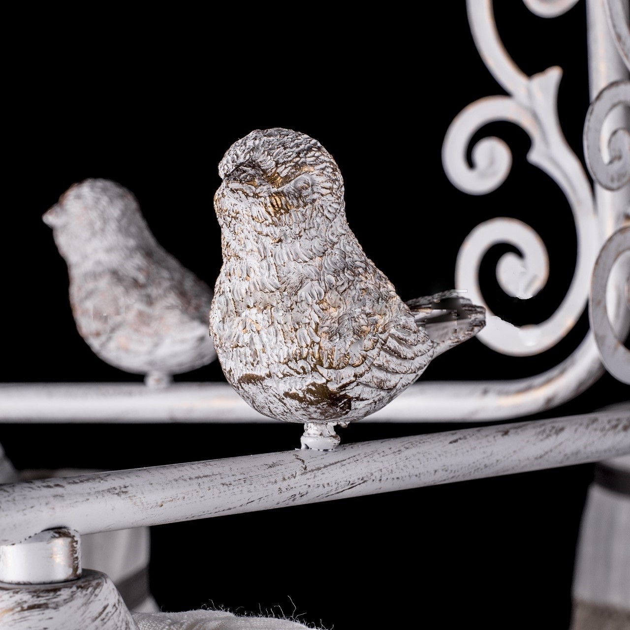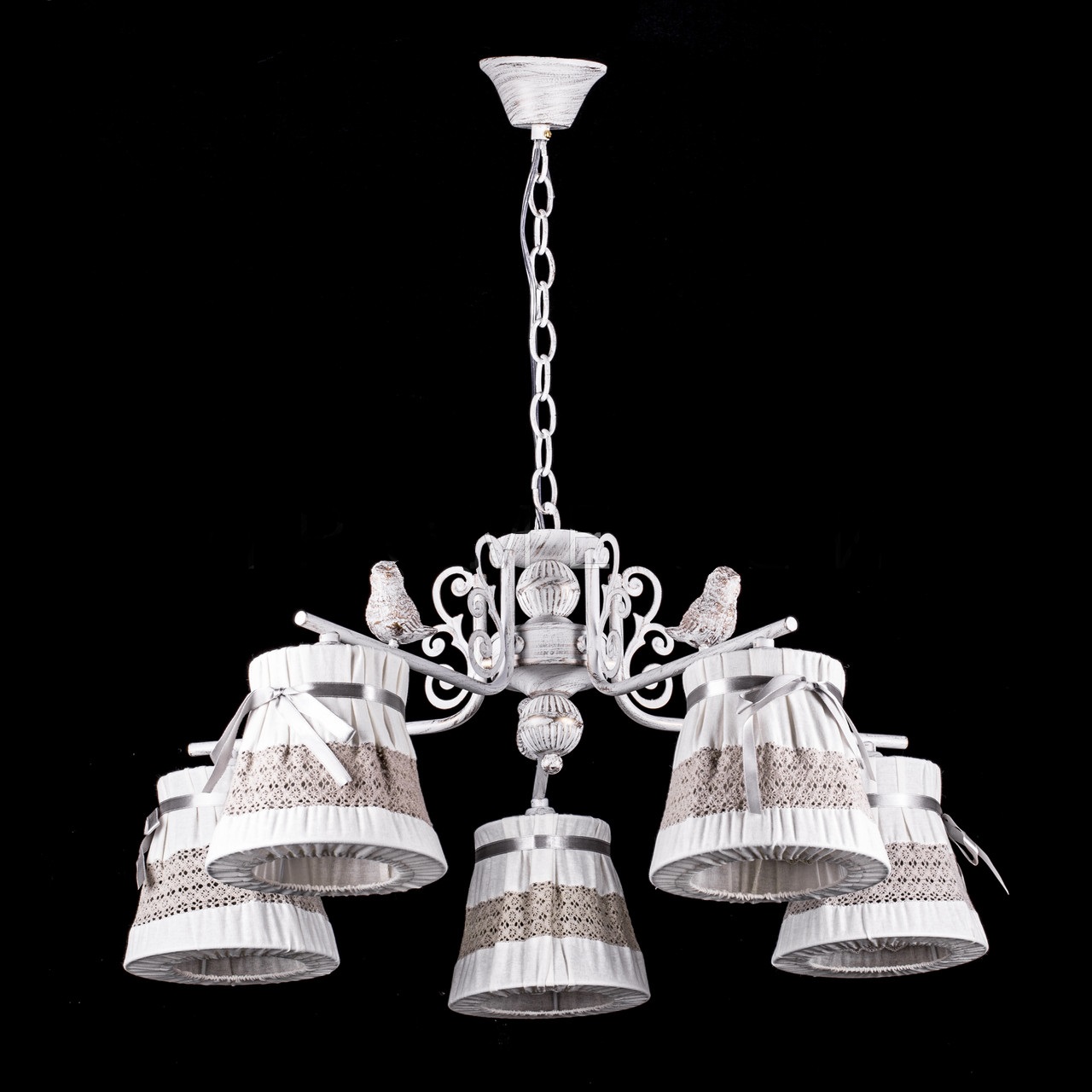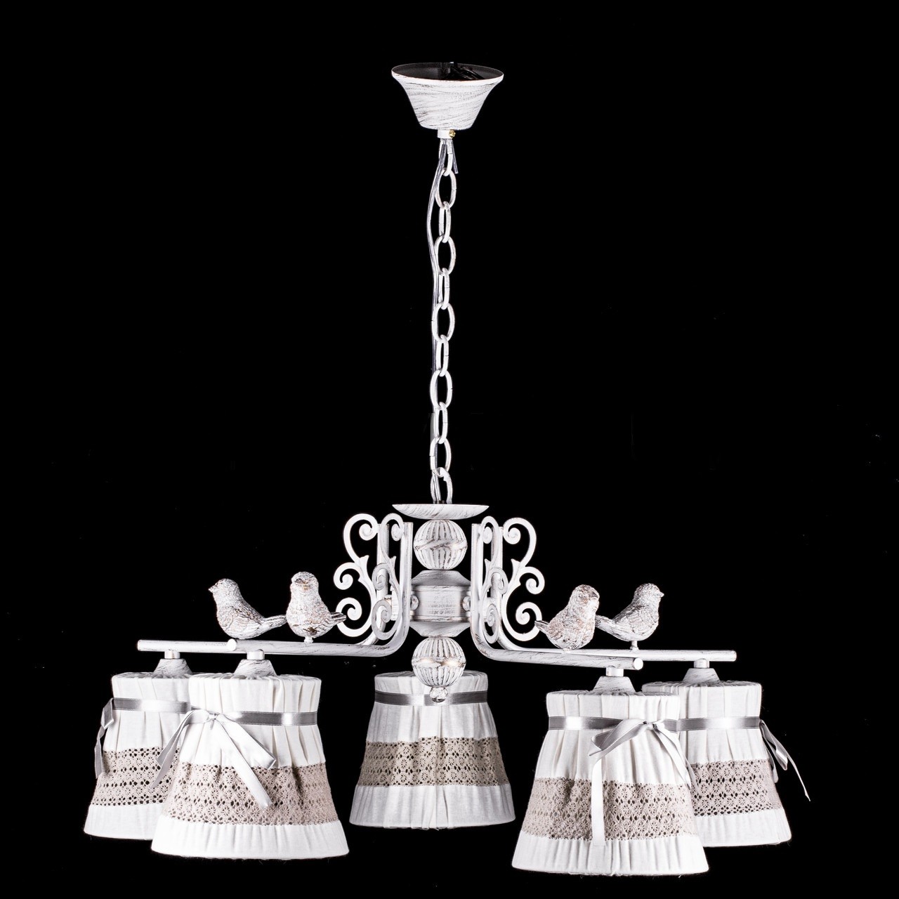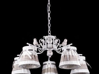 Люстра на цепи в стиле прованс идеально подойдет для светлого интерьера гостиной или спальни. Каркас люстры изготовлен из прочного, но легкого сплава металлов, окрашен в белый цвет с золотым патинированием, что придает эффект искусственного состаривания. Декоративные элементы выполнены в виде птиц из гипса окрашены в цвет каркаса. Текстильные абажуры легко снимаются для очистки.