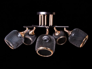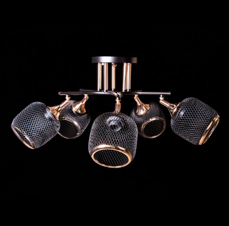 Современная потолочная люстра в стиле лофт на 5 лампочек прекрасно подойдет под стильный и современный интерьер. Каркас люстры окрашен в черный матовый цвет с элементами золота которые создают контраст на фоне основного цвета. Люстра подойдет для помещений со средними и низкими потолками. Лаконичный дизайн и отсутствие лишних декоративных элементов подчеркнет интерьер помещения. Патроны типа Е27 позволяют использовать большинство из предоставленных на рынке лампочек.
