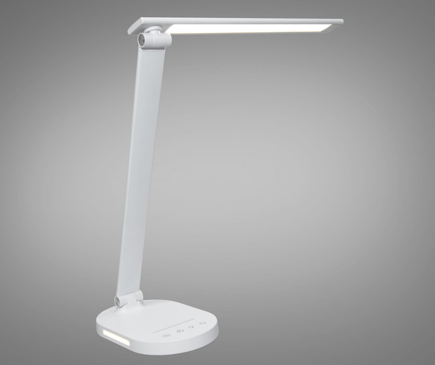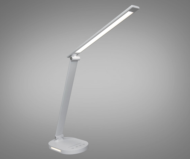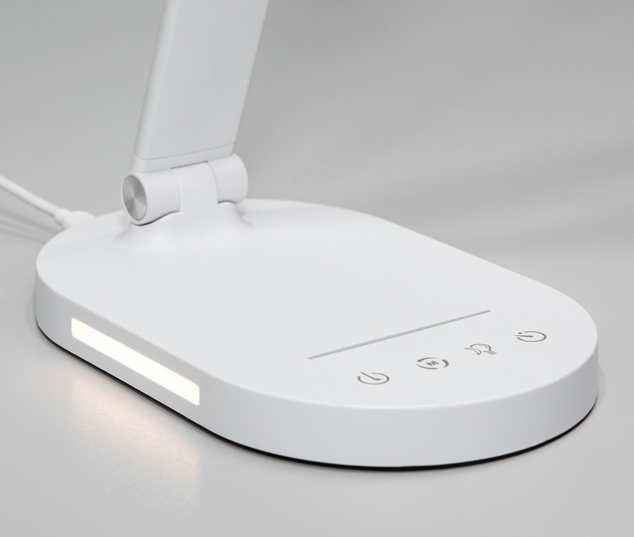 Стильная светодиодная настольная лампа с ночником идеально подходит для современного дома или офиса. Лампа характеризуется энергоэффективностью, обладает сдержанным и элегантным дизайном. Основной ее чертой является тонкий вертикальный ствол, который легко регулируется, с компактной сборкой, которая заканчивается горизонтально ориентированной светодиодной панелью, которая тоже легко регулируется и складывается и обеспечивает равномерный свет без ослепительных эффектов. В основе лампы есть панель с сенсорными кнопками для управления функциями лампы,такими как регулировка яркости и температуры света. Это позволяет пользователю настроить свет от яркого и энергичного до мягкого и теплого, что соответствует идивидуальным предпочтениям пользователей. Интегрированный ночник создает мягкий свет, идеальный для использования в спальне или детской комнате, обеспечивая достаточно света для ориентации в темноте, но при этом не смущает или не мешает сну. Лампа выглядит компактной и мобильной, что делает ее удобной для перемещения между комнатами.