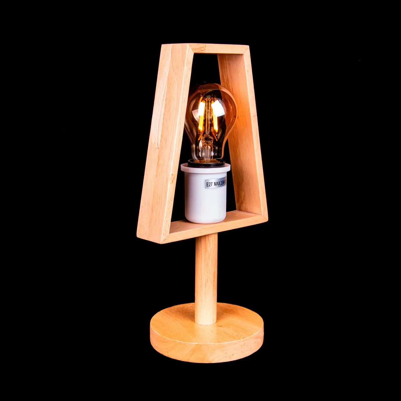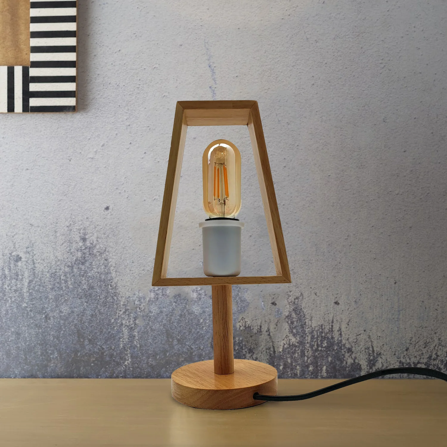 Настольная лампа на один патрон в стиле лофт станет стильным и практичным аксессуаром в комнате. Основание светильника и абажур в форме конуса выполнены из натурального дерева, что создаёт современный и лаконичный дизайн. В данной модели установлен патрон типа E27. Лампа включается кнопкой на проводе и работает от сети через подключение в розетку.
