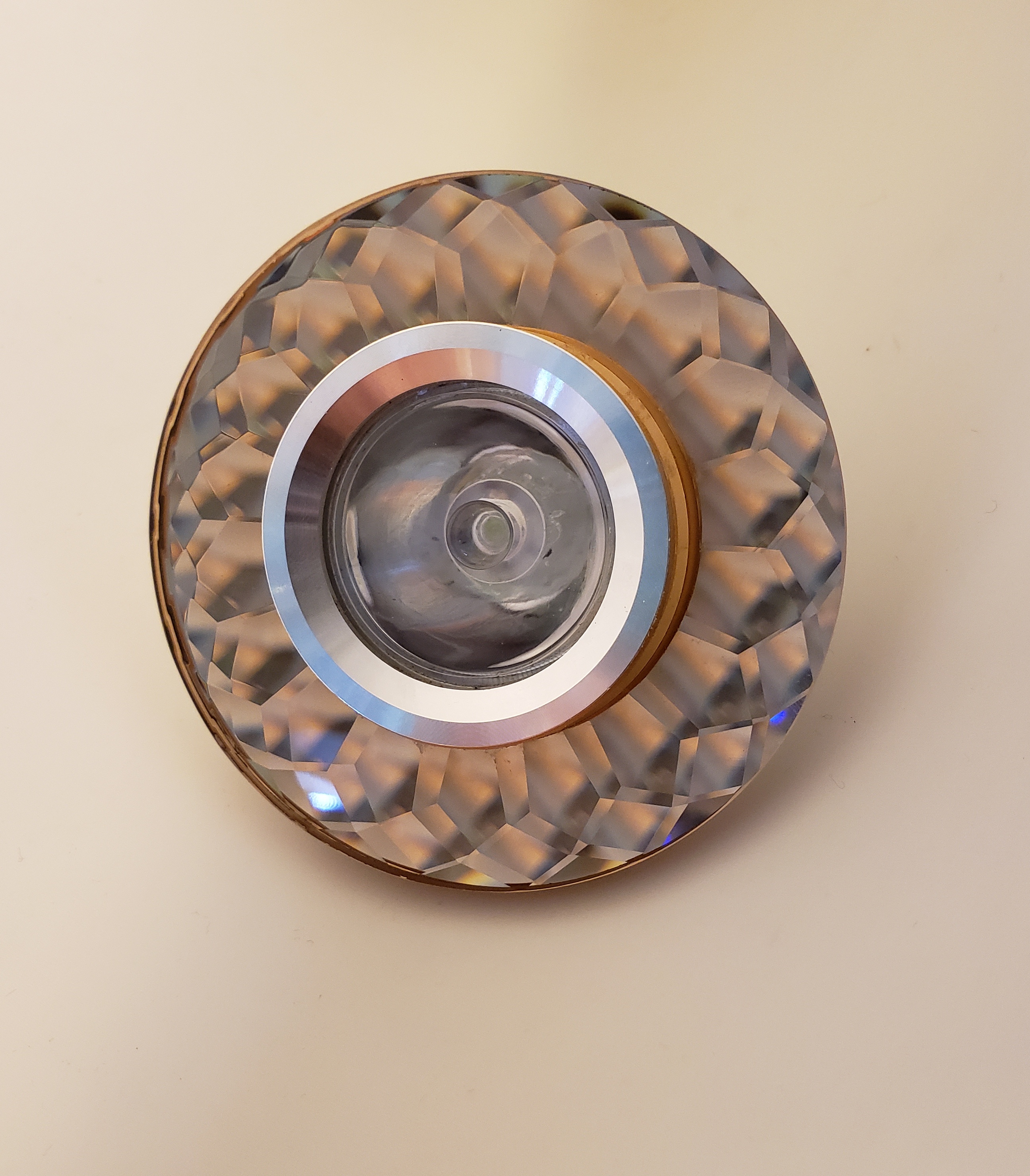 Изюминкой модели является сочетание нежного кофейного оттенка и граненого зеркального покрытия. Одного такого светильника достаточно для создания комфортной обстановки на площади 2 кв.м. Использование светодиодных ламп позволит сэкономить расходы на электроэнергию. В светильник встроена светодиодная лампочка мощностью 3W.